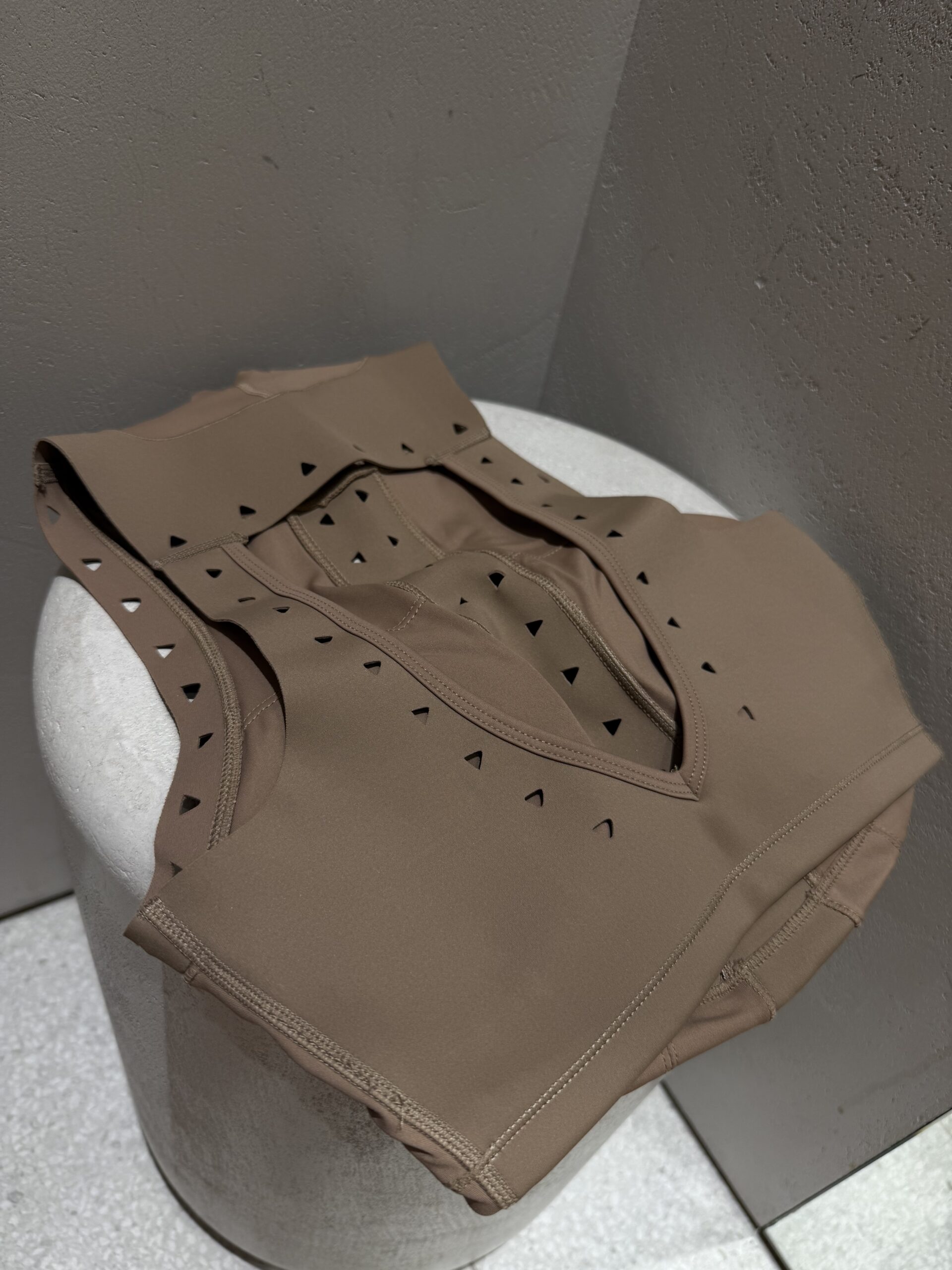 Modne detale wycinane laserowo oraz V-kształtna linia talii w legginsach optycznie wysmuklają i podkreślają figurę.